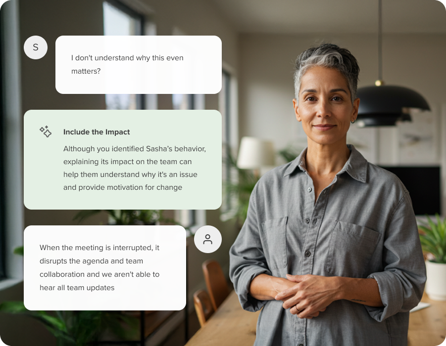 Coach Maya, your AI advisor, guides leaders through pivotal moments with personalized feedback and reflection prompts—available in simulations or standalone.