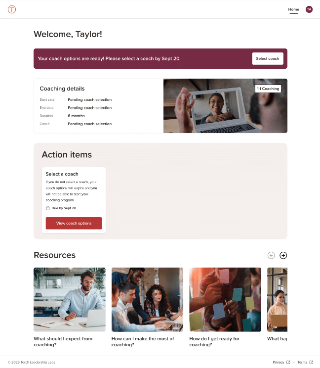 At Torch, we’ve optimized our onboarding experience to maximize participant engagement from the start. When participants log in to Torch, they arrive at a streamlined homepage that allows them to easily find information about their coaching engagement, identify and complete key action items, and access resources that walk them through how to make the most out of their coaching engagement, so they can hit the ground running.