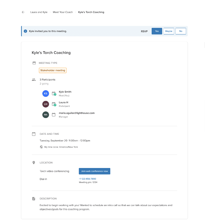 With Torch’s Manager Alignment Meetings, participants can invite their manager to a joint meeting with their coach. This enables coaches to gain more context around the team’s goals and challenges and helps them better understand the participant’s unique growth opportunities. On top of that, this feature allows participants to set growth expectations with their manager, right from the start, empowering managers to support the participant and hold them accountable through their growth journey.