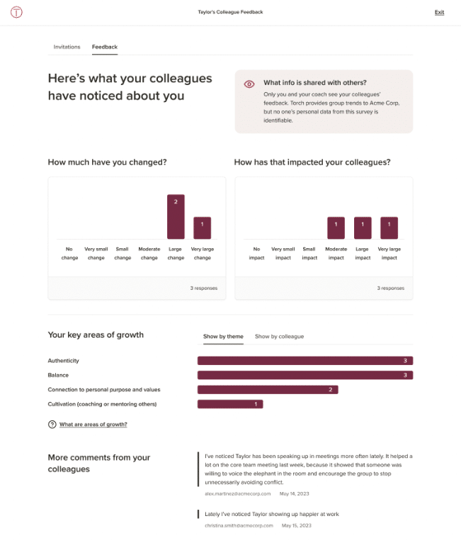 Torch also has a new peer feedback tool to provide participants with insights around their growth, including areas where they’ve improved in and where they can continue to grow. This new feature enables participants to request direct feedback from close colleagues, managers, or direct reports over the course of their coaching engagement. This allows each participant to understand whether their new behaviors are having a positive impact on those around them. The feedback is then summarized into a report that participants and their coach can use to identify additional areas of growth and opportunity.
