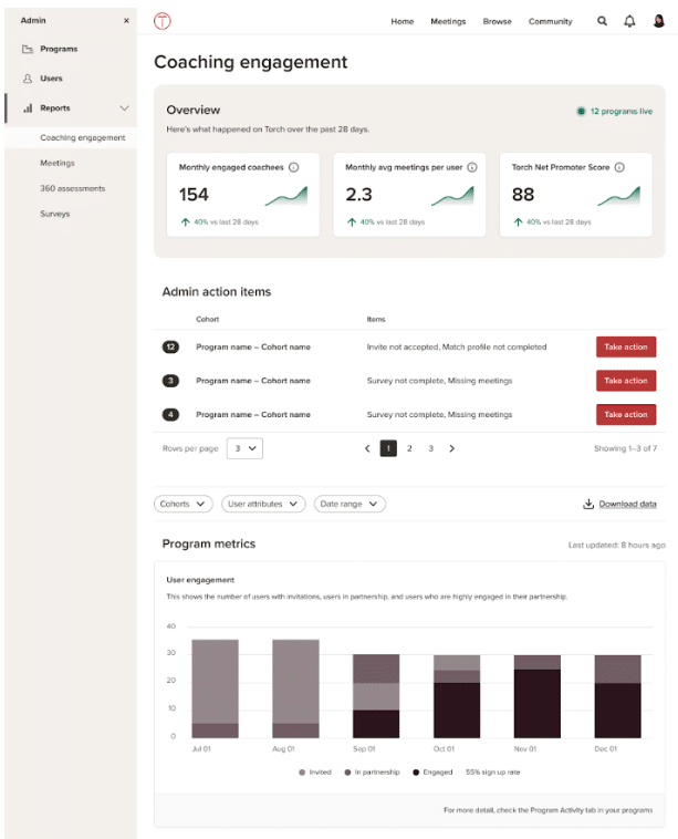 Admins can view program insights and data in Torch’s coaching engagement reports