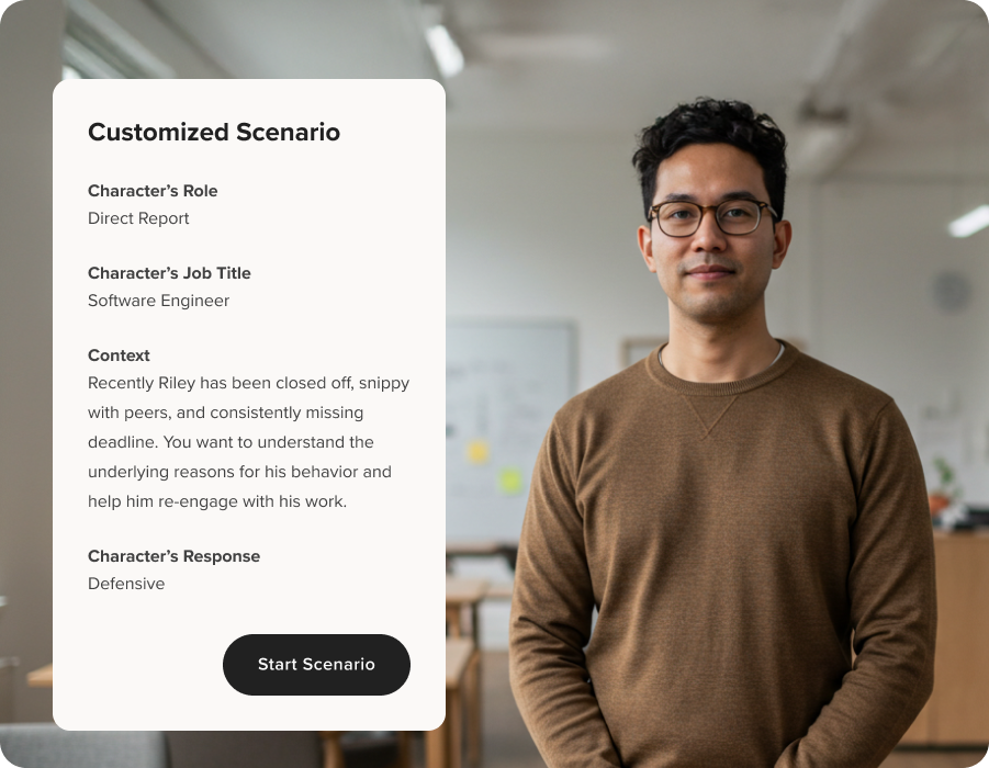 You’ll meet regularly to work through real challenges and build the leadership capacities needed for long-term impact. Between sessions, immersive AI-powered simulations give you a safe space to rehearse high-stakes moments and apply what you’re learning. And behind the scenes, our feedback loop surfaces patterns and progress, connecting individual growth to business outcomes, without compromising confidentiality.