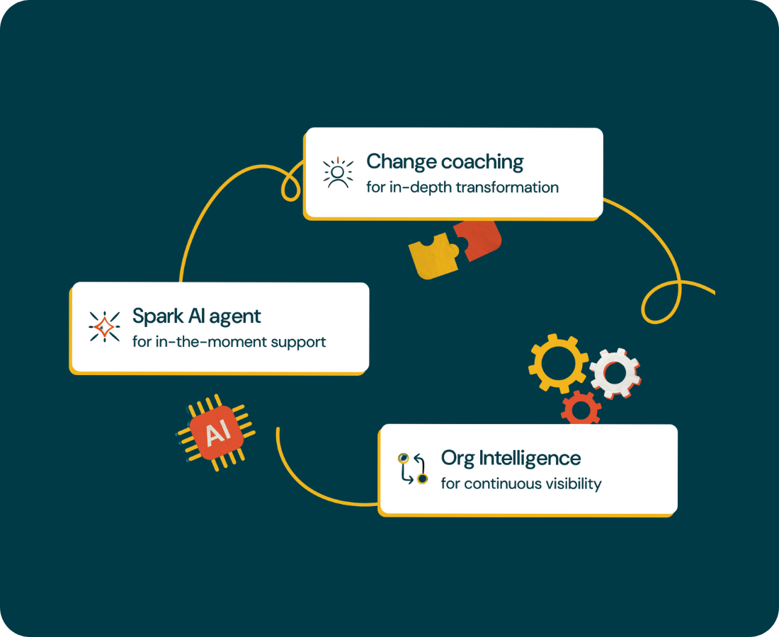 Executives see where change is building momentum or hitting resistance across teams in real time, not months later through surveys. Intelligence surfaces early warning signals and shows what’s working, so leaders can scale success and address barriers before they derail progress.